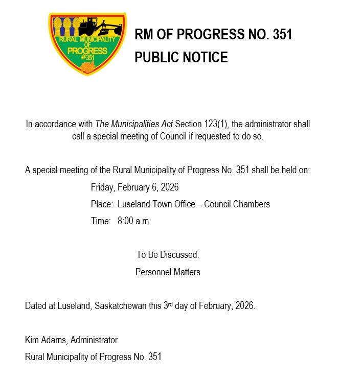 Welcome to the R.M. of Progress No. 351Council meetings are held on the second Wednesday of each month unless otherwise stated. Meetings start at 9:00AM from November until April, and 8:00AM from May until October. Council meetings are held in the board room in the RM of Progress & Town of Luseland office building, located at 503 Grand Avenue, Luseland, Saskatchewan. The next regular meeting of council will be held on Wednesday, February 11, at 9:00 a.m. Please be advised that the March regular meeting of council has been rescheduled to: Wednesday, March 18, at 9:00 a.m.