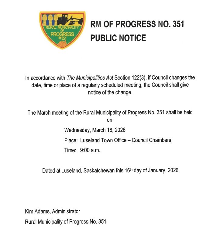 Welcome to the R.M. of Progress No. 351Council meetings are held on the second Wednesday of each month unless otherwise stated. Meetings start at 9:00AM from November until April, and 8:00AM from May until October. Council meetings are held in the board room in the RM of Progress & Town of Luseland office building, located at 503 Grand Avenue, Luseland, Saskatchewan. The next regular meeting of council will be held on Wednesday, February 11, at 9:00 a.m. Please be advised that the March regular meeting of council has been rescheduled to: Wednesday, March 18, at 9:00 a.m.